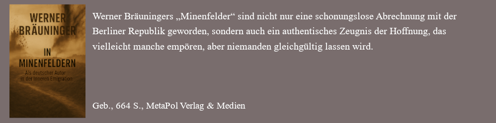 Die Wahrnehmung des rapiden Abstiegs unseres Landes ließ Werner Bräuninger früh zu einem unerschrockenen publizistischen Streiter werden. Jetzt unternimmt er eine Rückschau auf mehr als 35 Jahre Autorschaft inmitten eines destruktiven linken Zeitgeistes. Entstanden ist dabei beinahe ein autobiographischer "Entwicklungsroman" der Bundesrepublik, in dem sich der Autor als präziser Beobachter und sensibler Seismograph erweist. Mit erzählerischer Verve schildert er Formung und Fixierung seiner Anschauungen, beginnend an der Frankfurter Schillerschule, sowie vielfache Anfeindungen durch den Mainstream, die ihn geradezu in die Innere Emigration zwangen. Geschildert werden prägende Begegnungen, so etwa mit Armin Mohler, Hans-Dietrich Sander und Günter Maschke. In vorliegendem Buch lernt der Leser aber auch den Menschen kennen, der offen über Erfolge und Zweifel sowie den "letzten Dingen" spricht. So ist dieses Buch nicht nur eine schonungslose Abrechnung mit den etablierten Akteuren der Berliner Republik geworden, sondern auch ein authentisches Zeugnis der Hoffnung, das vielleicht manche empören, aber niemanden gleichgültig lassen wird.